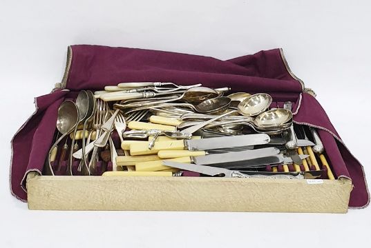 Quantity of mother-of-pearl handled dessert eaters, quantity plated table flatware and cream-handled knives