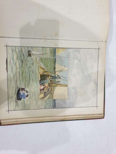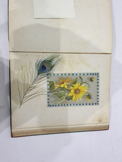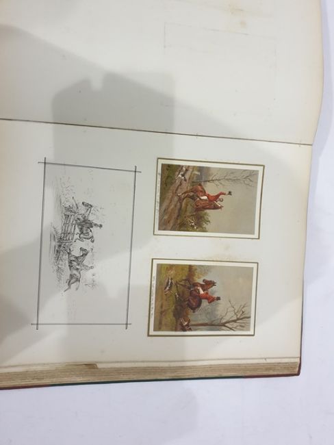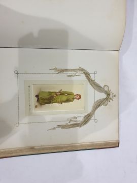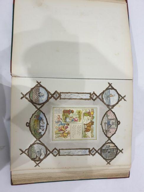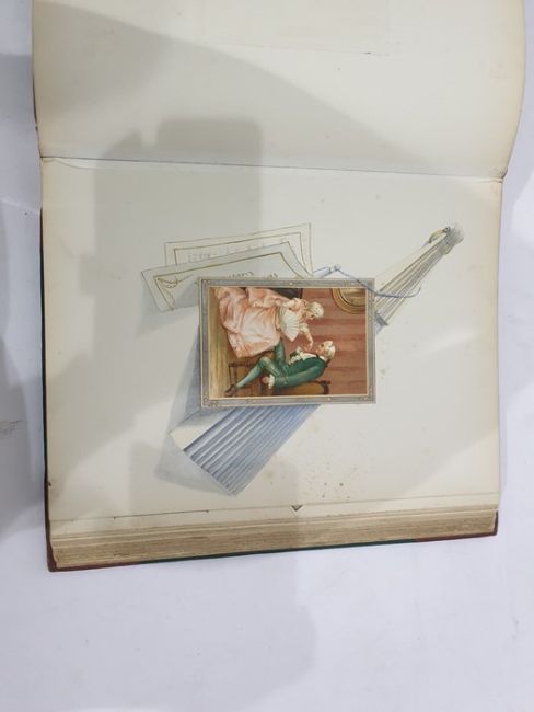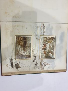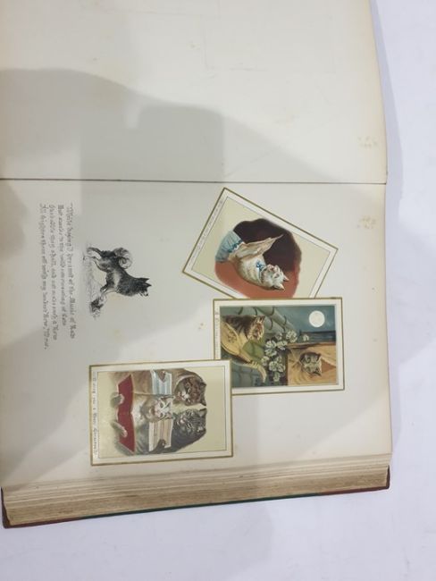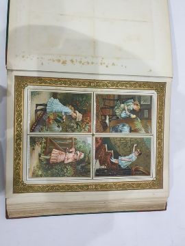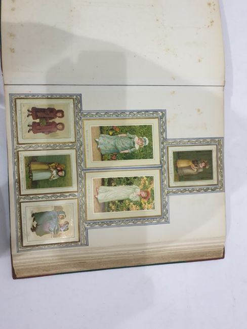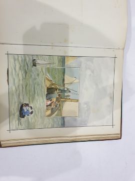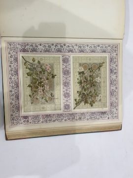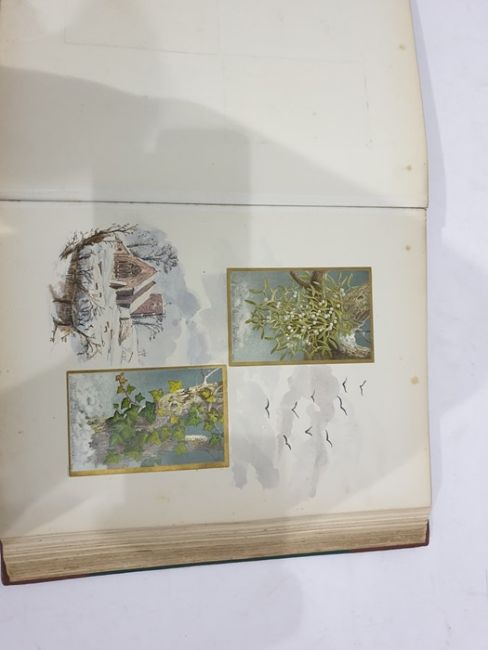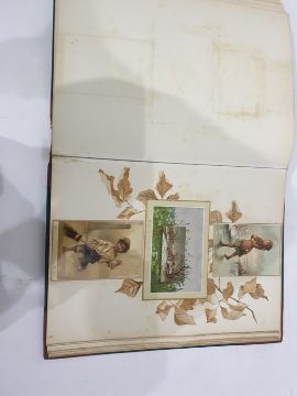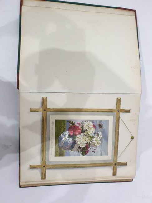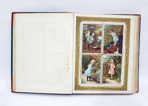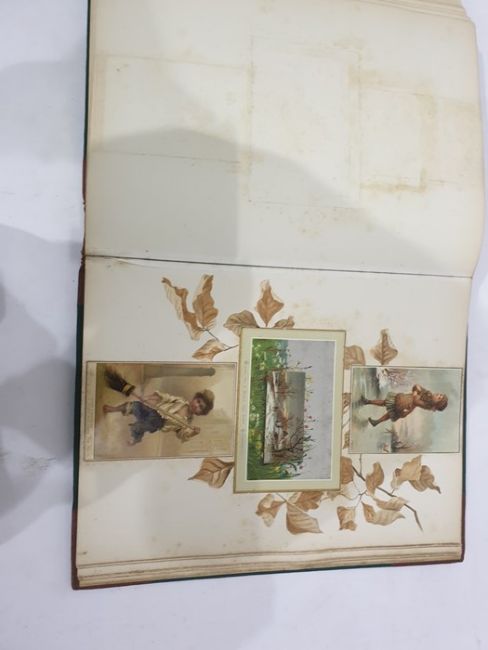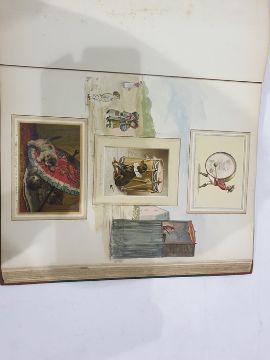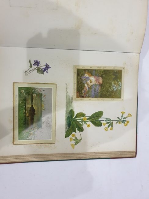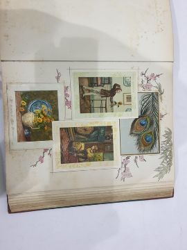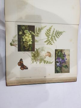 Victorian scrapbook with numerous chromolithographic prints, postcards and scraps, many pages with pen, ink and watercolour additions of leaves, flowers, butterflies and various scenes |