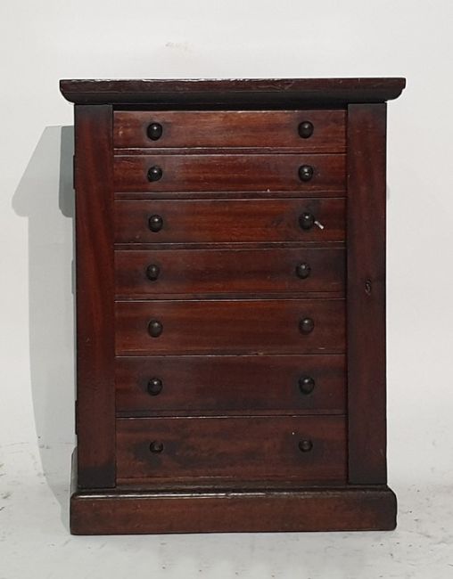19th century mahogany table-top collectors Wellington chest of seven drawers, raised upon plinth base