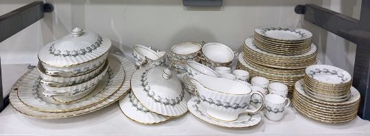 Minton table service for eight covers in the 'Ermine' pattern, comprising plates of three sizes, oval serving dishes, meat plates, two-handled soup bowls, coffee cups and saucers, etc