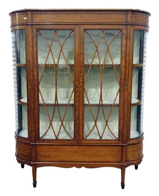 19th century satinwood and cross-banded two-door display cabinet, the moulded top edge above the cross-banded panel, above the two astragal-glazed doors enclosing three shelves, flanked by bowed glass corners, the whole raised upon square section tapering supports to spade feet, 137.5cm x 167cm approx