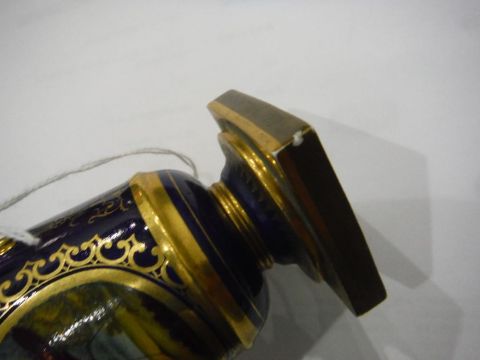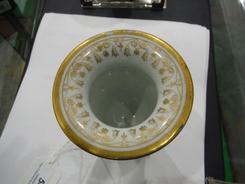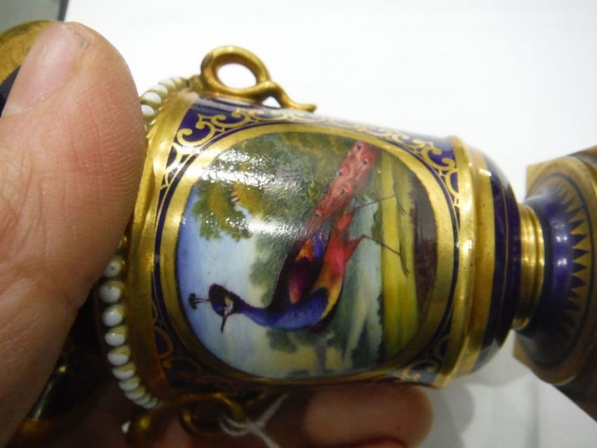 Pair Flight Barr & Barr porcelain vases, each urn-shaped and with pair scrolling dragon handles, each blue ground and painted with two circular panels of exotic birds within gilt borders, beneath white jewelled shoulder, all on circular foot and square gilt plinth base, 11cm high, circa 1830/40 |