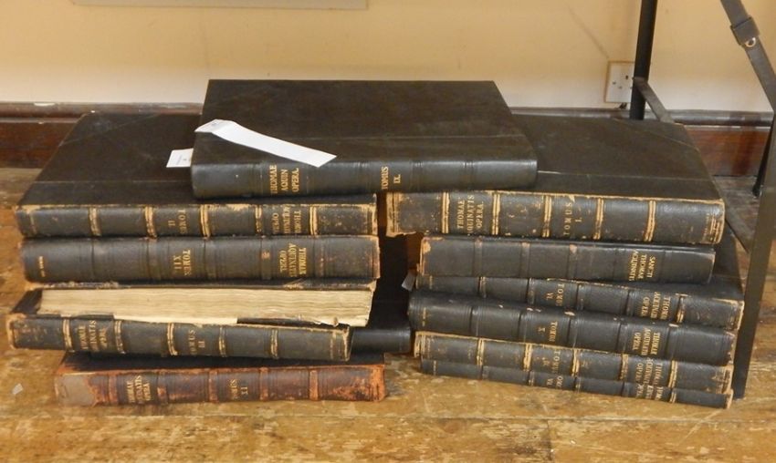 Thomas Aquinatis Opera Romae 1886 and other dates, text in Latin, plates, marbled ep, all full black leather, some rubbing and broken hinges, 12 vols and one other similar bound volume (13)
