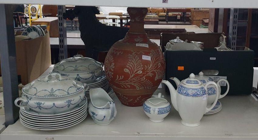 Grimwades "Myrtle" part dinner service including lidded tureens, dinner plates, serving platter, gravy jug, Johnsons Bros teapot, coffee pot, cream jug and three plates, white with Adam-style pale blue design and a terracotta large pot