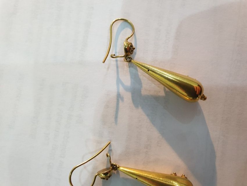 Pair of Victorian gold drop earrings, tear-shaped and applied with beaded scrolls, approx 4g Condition ReportPlease see attached images