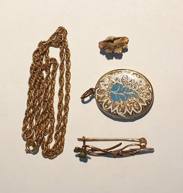 9ct gold and green enamel bar brooch, 9ct gold chain necklace and a gold plated and blue and white enamel oval locket pendant (3)