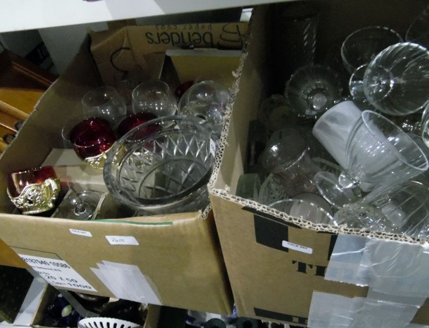 Two boxes of glassware including wines, vases and a modern wooden letter rack