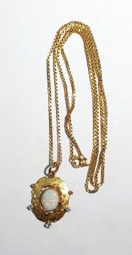 18K gold, opal and diamond pendant centred by single oval opal, the matt finish surround set five graduated diamonds and the fine box-link chain-pattern necklace