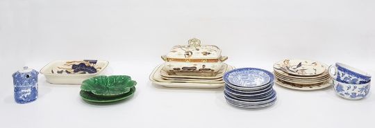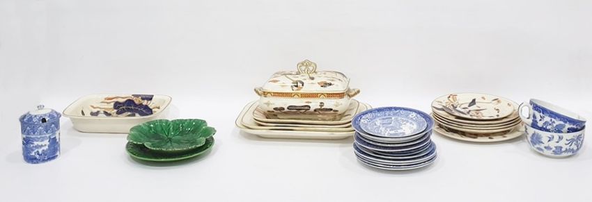 Edwardian pottery part dinner service in the Imari palette, 'Japan Casket' pattern, comprising tureens, graduated meat plates, etc plus other items including 2 leaf dishes and some blue and white ceramics