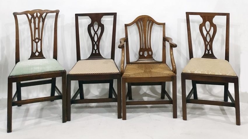 Five assorted chairs including Georgian oak-framed country style carver chair with rush seat (5)