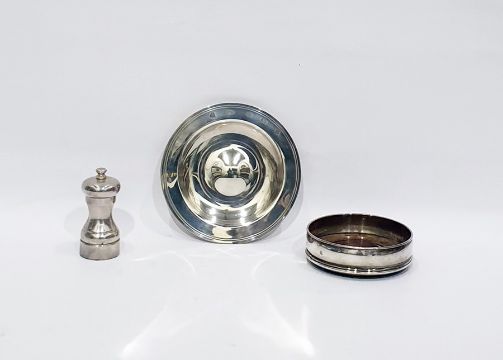 Modern silver dish by C J Vander Limited, Sheffield 2000, with Millennium mark, of plain circular form, 17cm diameter, 7oz approx, a modern silver wine coaster by David R Mills, London, of plain circular form with wooden base, 12cm diameter and a silver pepper grinder (3)