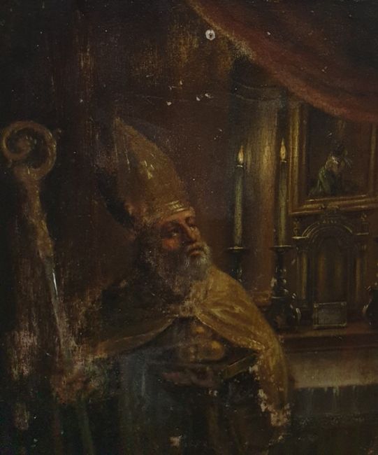 Possibly 19th century school Oil on panel Study of bishop wearing mitre and cloak, bearing crosier to his right hand in candle lit interior setting, unsigned, 18cm x 14.5cm