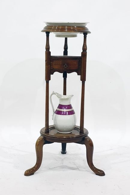 George III mahogany wash basin stand with under-shelf, lower tier, on cabriole supports with ceramic jug and basin