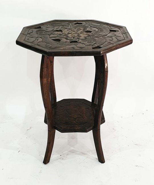 Eastern hardwood octagonal centre table with carved dragon motif to top, 60cm x 72cm