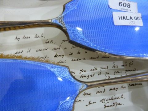 Silver and enamel three-piece dressing table set decorated with engine-turned and floral blue enamel panels, comprising two brushes and a hand mirror, in fitted caseCondition ReportThere is damage to both the larger hair brush and the mirror. Please see images