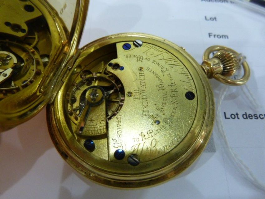 Gent's 18ct gold hunter pocket watch by J W Benson, London, circular white enamel dial with subsidiary seconds dial, Roman numerals, the case numbered 1283, in case Condition ReportDent to outer edge of case, surface scratches, dings to the outer case, 5cms diam. 117 grms gross, no guarantee of working order.