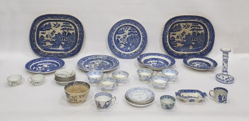 Pair of Victorian blue and white meat plates in the 'Willow' pattern and various other items of blue and white