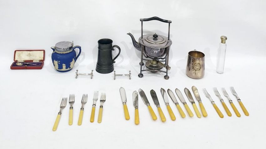 Silver commemorative teaspoon modelled as a reproduction of the anointing spoon for the 1937 Coronation in fitted case, a silver plated spirit kettle on stand, an Adams blue and white jasperware jug with silver plated mounts and various other items