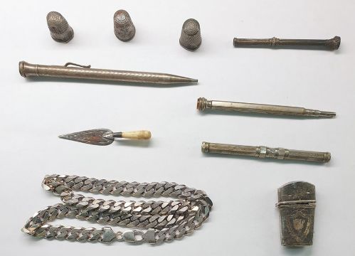 Heavy silver filed curb link chain, a late 18th/early 19th century silver etui case with bright cut decoration (damaged), a silver whistle, assorted propelling pencils, thimbles, etc