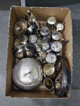 Silver plated serving dish, assorted silver plated hot water jugs, condiments, etc