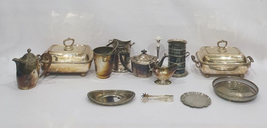 Quantity of assorted electroplated items to include wine bottle holder, the ribbed body with stylised love-heart decoration, two tureens, teapot, etc
