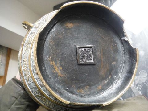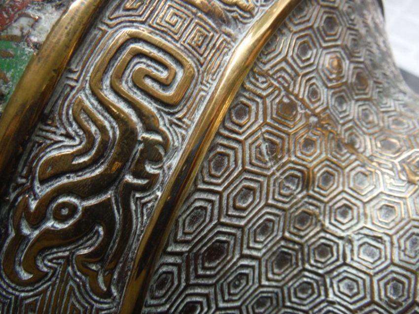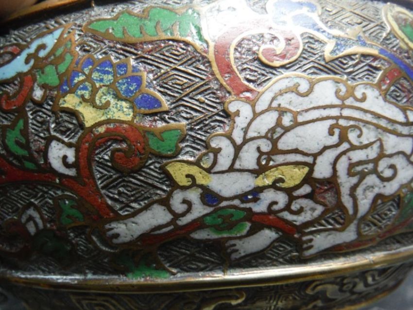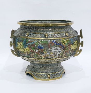Chinese bronze and cloisonne enamel three-handled jardiniere, having band of dragons to the bulbous body, allover cast hexagonal trelliswork and raised on circular indented foot, 20cm high x 27cm diameter