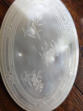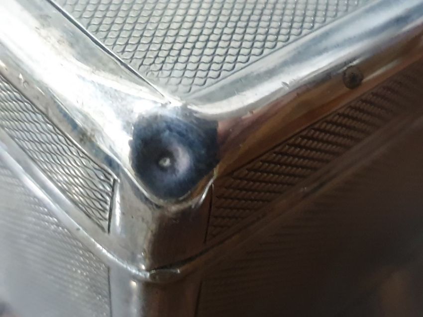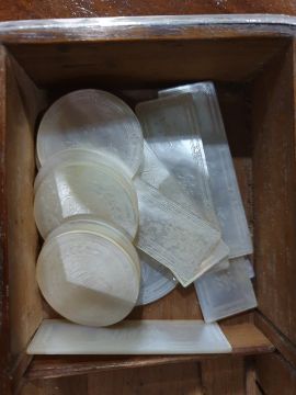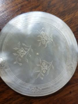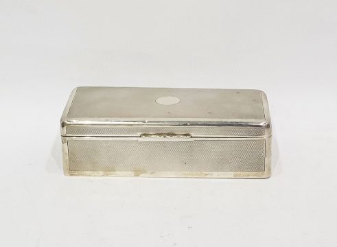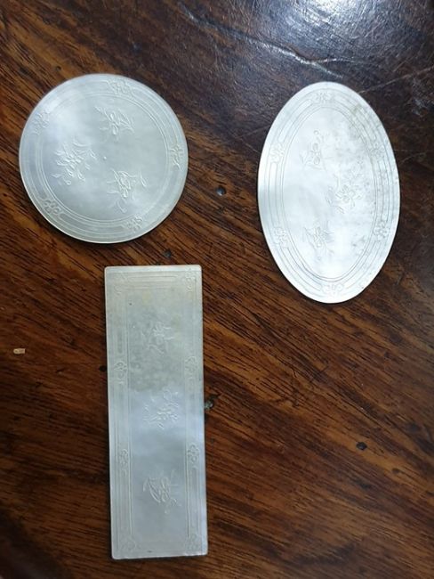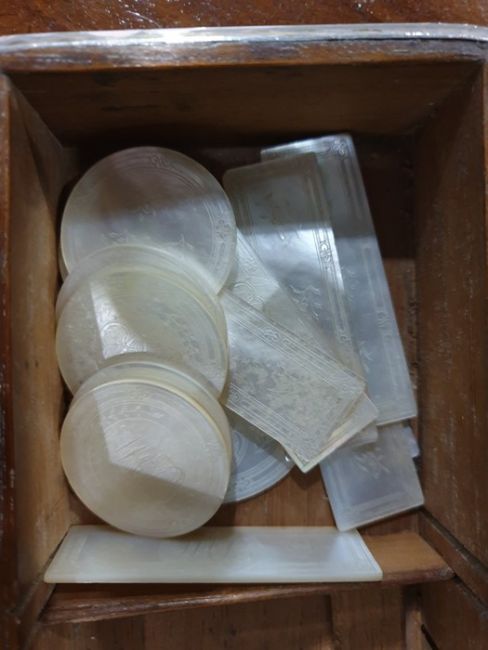 Birmingham silver cigarette box, lined, with contents of assorted Chinese mother-of-pearl countersCondition ReportThere are 2 oval counters one with a chip in the corner and dents on the back. There are 8 rectangle counters and 9 circle counters some have scratches on them. The divider inside the box is damaged and there is wax on the back and a dent in the corner.