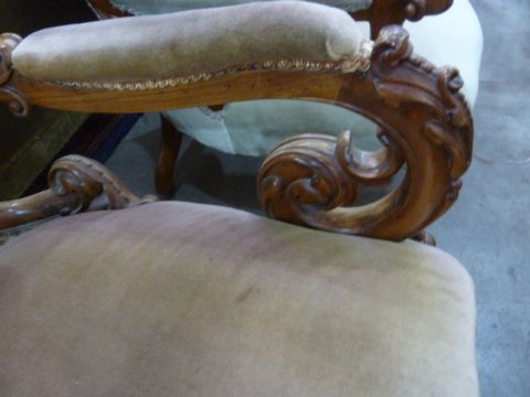 19th century salon armchair with carved top rail, buttonback upholstery, carved and scroll arms, serpentine front seats, cabriole supports Condition Reportno apparent sign of worm or restoration