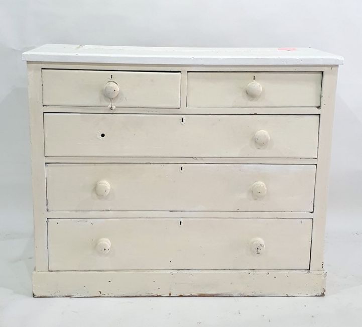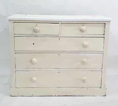 A white painted chest of two short above three long drawers, to plinth base, 122cm x 100.5cm