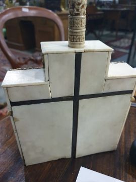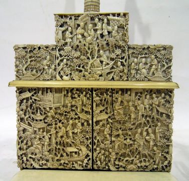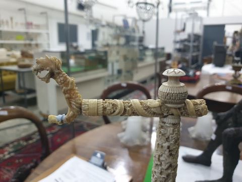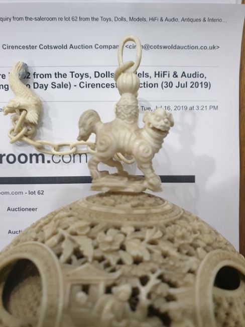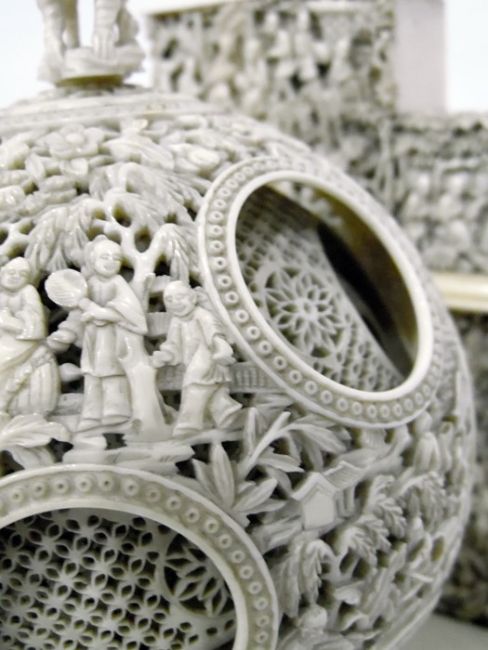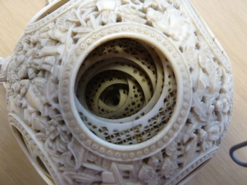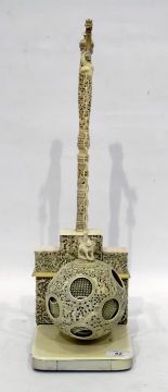 19th century Chinese carved ivory puzzle ball on stand, the ball surmounted by Dog of Fo, the outermost ball carved and pierced with assorted figures, foliage and thirteen open circular 'windows' revealing the seventeen carved and pierced balls beneath, the puzzle ball is suspended via an ivory chain on a stand, with the protruding arm formed as dragon, its body and tail winding its way amongst foliage to the upright, also formed from ivory, and intricately decorated with samurai and further figures, the stand with carved ivory panels, featuring various figures, pagodas and boats (stand 48cm tall, and ball approx 11cm diameter) (when bought by the owner's grandfather he was told that it had taken 3 generations of the family to carve it).  Condition ReportThere are a few small cracks to the front of the stand as well as a chip on the edge of the base of the stand. One of the inner balls in the puzzle could be damaged. There is a repair to the mouth of the stand holder. There looks to be some marks on the bottom of the ball possibly repair. See attached images. weight 300gms approx  There is a bag of pieces that are part of the itemWe have counted at least 18 layers including the outside ball