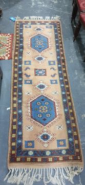 Wool runner of geometric design in blue and pink, 218cm x 74cm