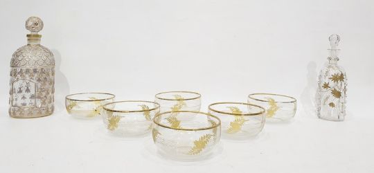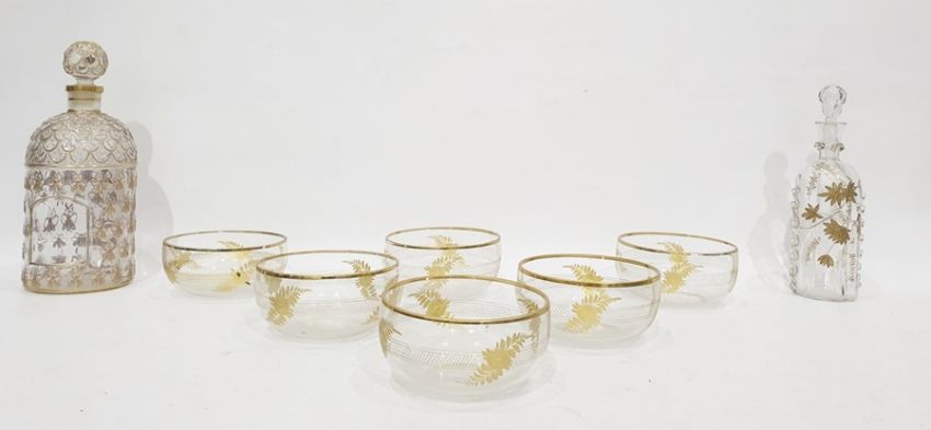 Set of six gilt bowls each with gilt rim, gilt floral and fern decoration, 11.5cm diameter, a gilt glass scent bottle with bee decoration and a continental gilt gilded gilt glass small liqueur bottle with frilled decoration (8) Condition ReportThe bottle left of photo 26cms high, 10cms width, small chips to the rim, gilt rubbed, , bottle right of photo - stopper not matching, small chip to one of the frills, gilt rubbed. The bowls - gilt rubbbed, chip to the rim of one, floral decoration not matching the set.