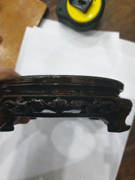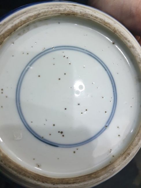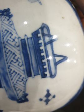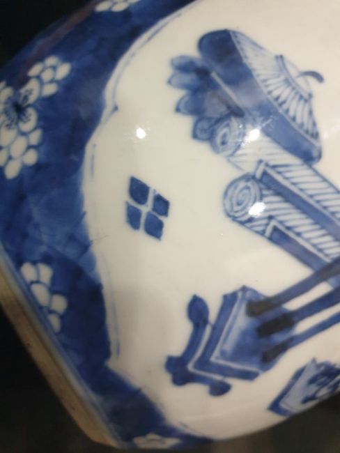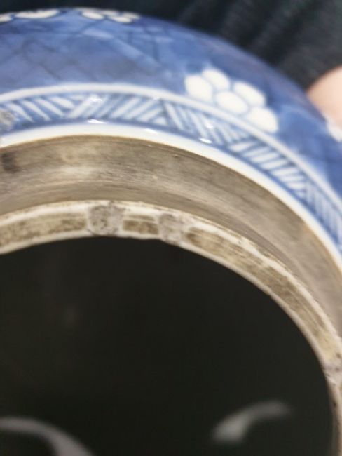 There are some small chips along the rim as well as marks on the bottom of the vase. There are some small scratches to the side and some of the pattern is fading. See attached images.