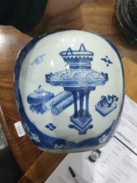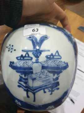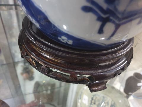Oriental blue and white porcelain ginger jar decorated with panels of vases on blue and white prunus blossom ground with pierced foliate scroll carved hardwood cover and stained wood pierced 19.5cm high stand