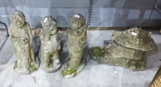 Pair of composite stone owl bodied planters and four composite stone garden ornaments (6)