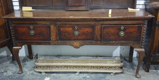 An 18th century and later North Country oak dresser base with three cross banded drawers and the whole raised upon cabriole supports, 180cm x 82.5cm