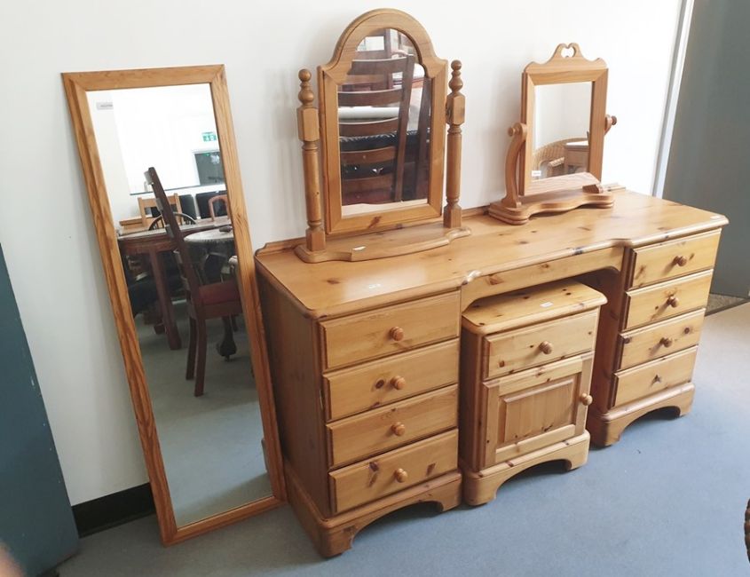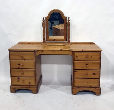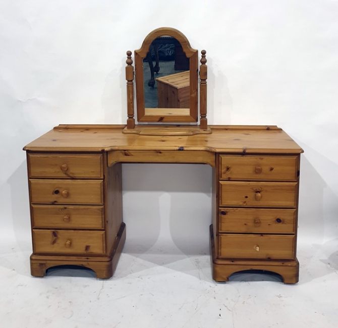 A 20th century pine dressing table of eight drawers, to bracket feet, a bedside cabinet with single drawer above cupboard door, two pine-framed swing mirrors and a rectangular wall mirror (5)