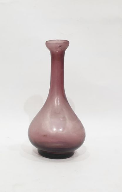 Amethyst glass bottle vase and pair of miniature verre eglomise baluster vases, footed and ribbed, 7.5 inches high (3)