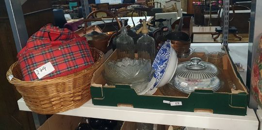 Two vintage soda syphons, a glass marked "Schweppes limited", a set of four bowls, a small cat basket, an alabaster table lamp, various 78 records and an earthenware lidded casserole and a framed tapestry