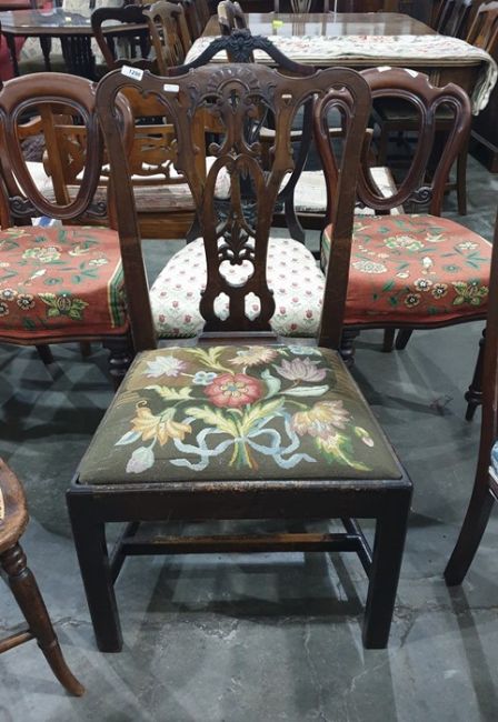 18th century mahogany chair, the carved toprail above the shaped and pierced backsplat, needlework upholstered drop-in seat, square section supports, stretchered base and another further bedroom chair (2)