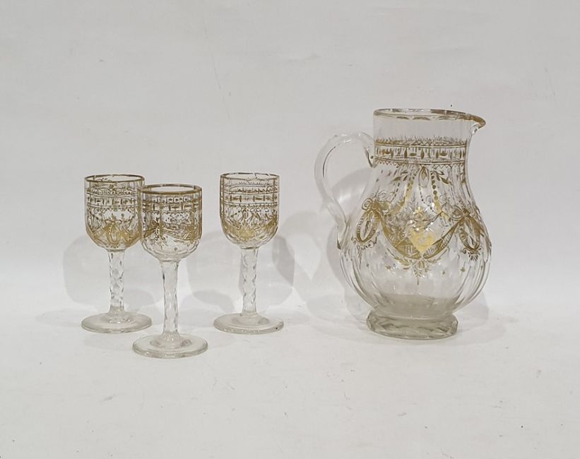Late Victorian/Edwardian cut glass gilt jug faceted body floral and festoon decorated and three matching goblets with faceted stands (4)Condition ReportGoblets 15cms high, one has slight chip to rim, the jug is 21cms high, gilt good, surface scratches