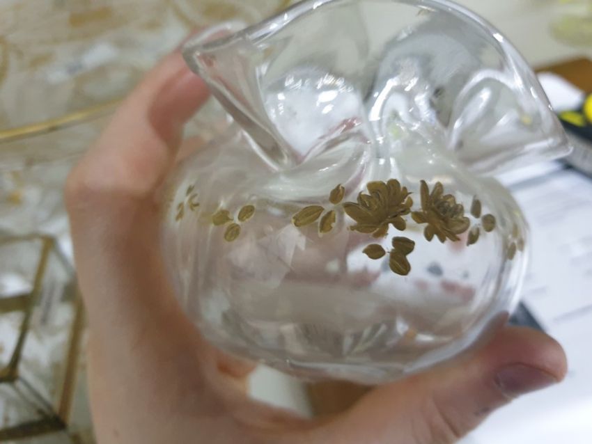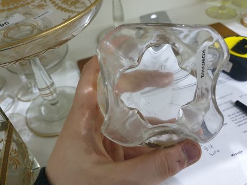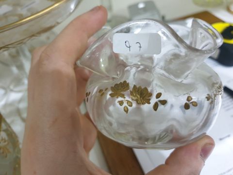 The tall vase is 17.5 cm tall, 3.5 cm wide at top and 5.5 cm wide at the base. The base is slightly loose. The trinket dish is 14 cm wide x 11 cm wide and 3.5 cm tall. The gilt is slightly loose and one of the handles looks bent. The glass dish is 15 cm in diameter and 2.5 cm tall. Another of the vases is 12 cm tall 8 cm in diameter at top and 6.5 cm in diameter at the base. The glass marked cricklite is very chipped around the rim. It is 12 cm tall, 3 cm in diameter at the top and 8 cm at the base. Another of the vases is 11.5 cm tall and 6 cm diameter. The dish with cover is 12 cm tall with the cover and 15 cm in diameter, without it is 2.5 cm tall. The cover is 10 cm in diameter and 11 cm tall. See attached images.