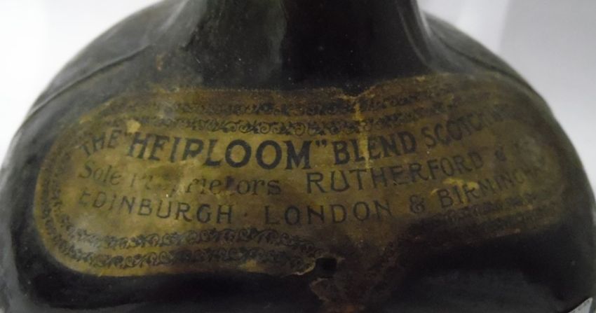 Antique bottle labelled "The Heirloom" blend scotch whiskey sole purveyors Rutherford and Kay Edinburgh London and Birmingham with original wax seals, and a boxed bottle of Sakura-Masamune Japanese Saki with saki server and four cups (2) Condition ReportPlease images - the level of whisky appears to be just above the neck/ label
