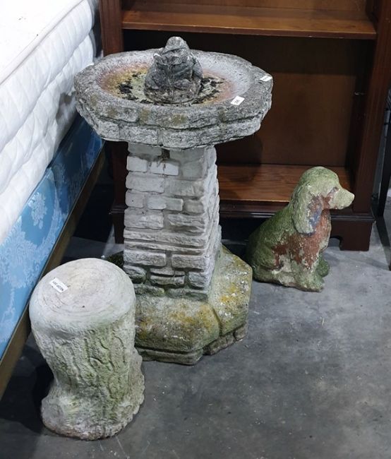 A stoneware bird bath, a stoneware seated Spaniel and three other garden ornaments (5)