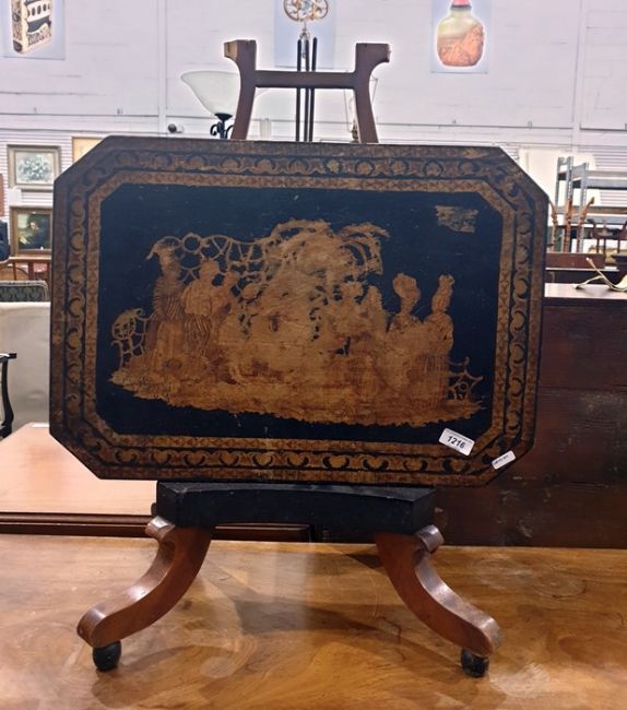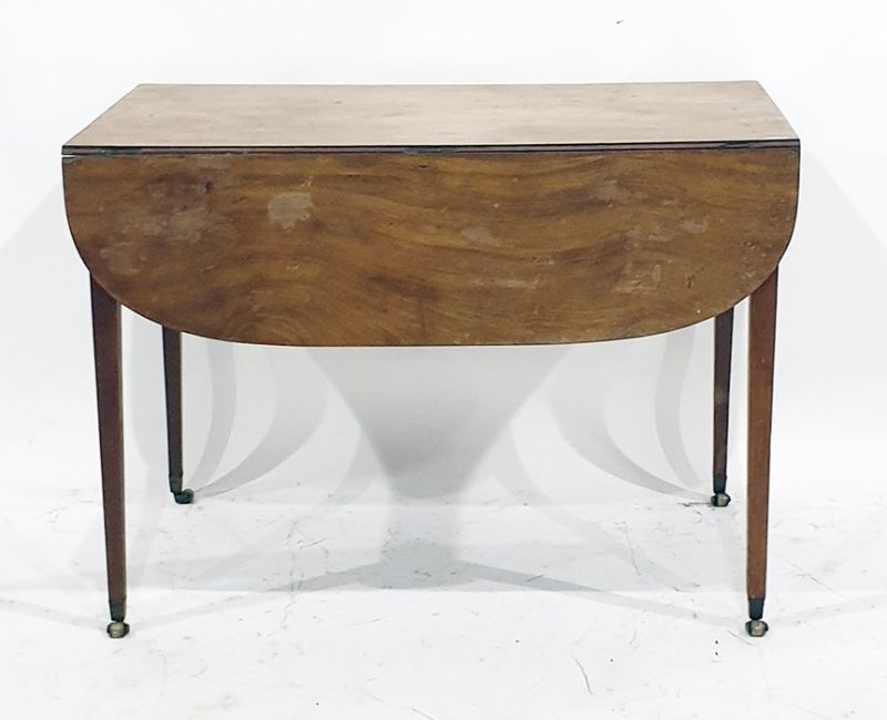 Georgian mahogany Pembroke table, rectangular with rounded drop-ends, on square tapering supports with brass caps and castors, 99cm wide and a centre table of elongated octagonal form, on a lyre-shaped pedestal quatrefoil base