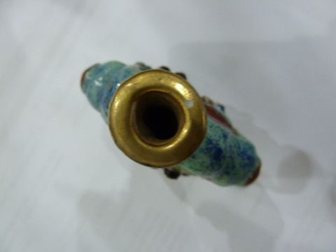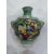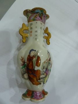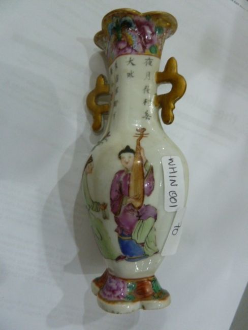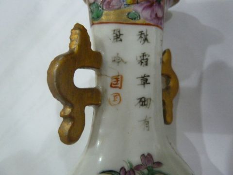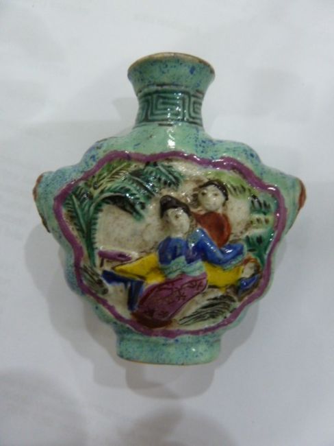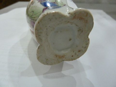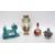 Japanese small bottle vase decorated in iron red with floral decoration, a small Canton porcelain baluster vase quatrefoil lobed with butterfly border figure and character marked decorated 14cm high porcelain scent bottle and turquoise glazed temple dog (4)