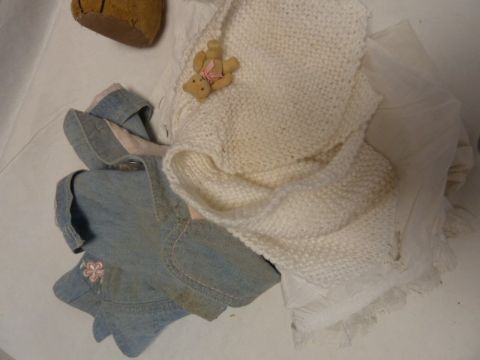 A large straw stuffed bear much of the plush worn off and stitched repairs, glass eyes with stitched nose and mouth, slight hump to his back 60cm approximately with Victorian dolls drawers, a nightie, a home knitted scarf with a teddy bear brooch and a baby's denim jacket from Mothercare