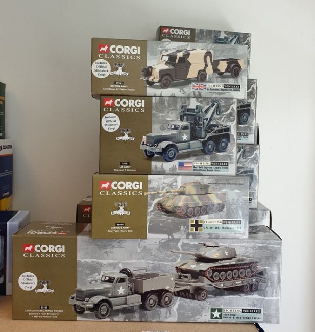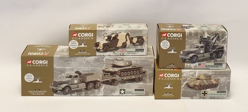 Collection of Corgi classics fighting vehicles to include ' 66601 German Army King Tiger Heavy Tank', 6 x '55601 US Army Diamond T Wrecker', etc (14)