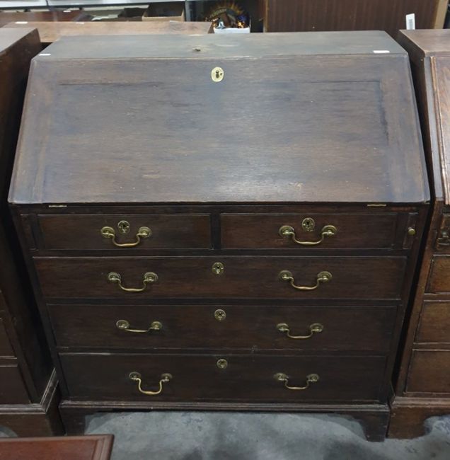 George III oak bureau with sloping fall front fitted interior with cupboard, drawers and pigeonholes, two short and three long graduated drawers below with brass swan-neck handles on bracket feet, 92cm wide