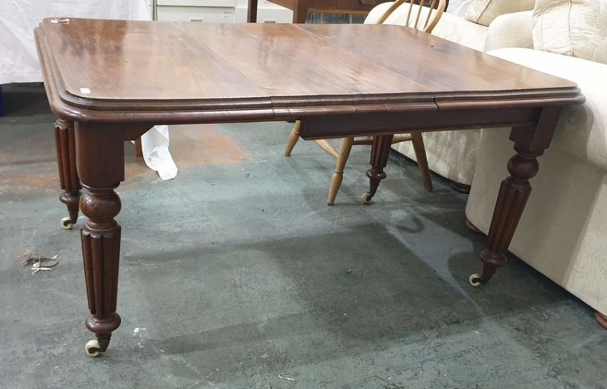 A early Victorian extending mahogany dining table, the moulded edge above turned and reeded supports, to white castors castors, 139cm x 98cm